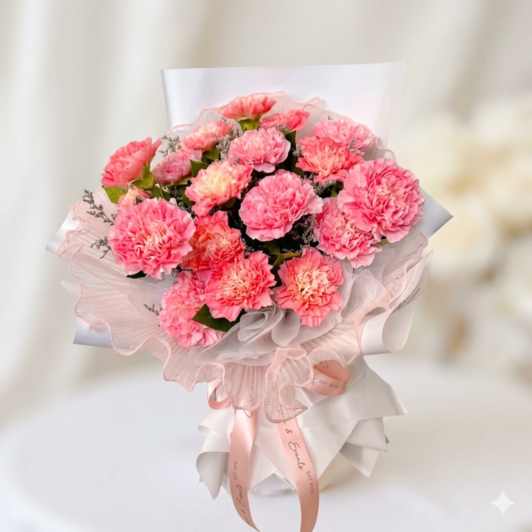 Pink carnations symbolize admiration, gratitude, and deep affection. Whether you choose 12, 24, or 36 carnations, each bouquet is freshly arranged by local florists and delivered directly to her door.